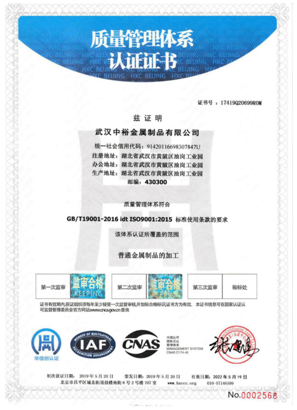 武漢中裕金屬制品有限公司(以下簡(jiǎn)稱公司)成立于1996年8月,民營(yíng)私人獨(dú)資企業(yè)。2010年8月投資1800余萬(wàn)元,在前川油崗工業(yè)園征地20畝,新建5000平方米的生產(chǎn)車間和1100平方米的辦公大樓,2011年8月全部峻工投入使用。